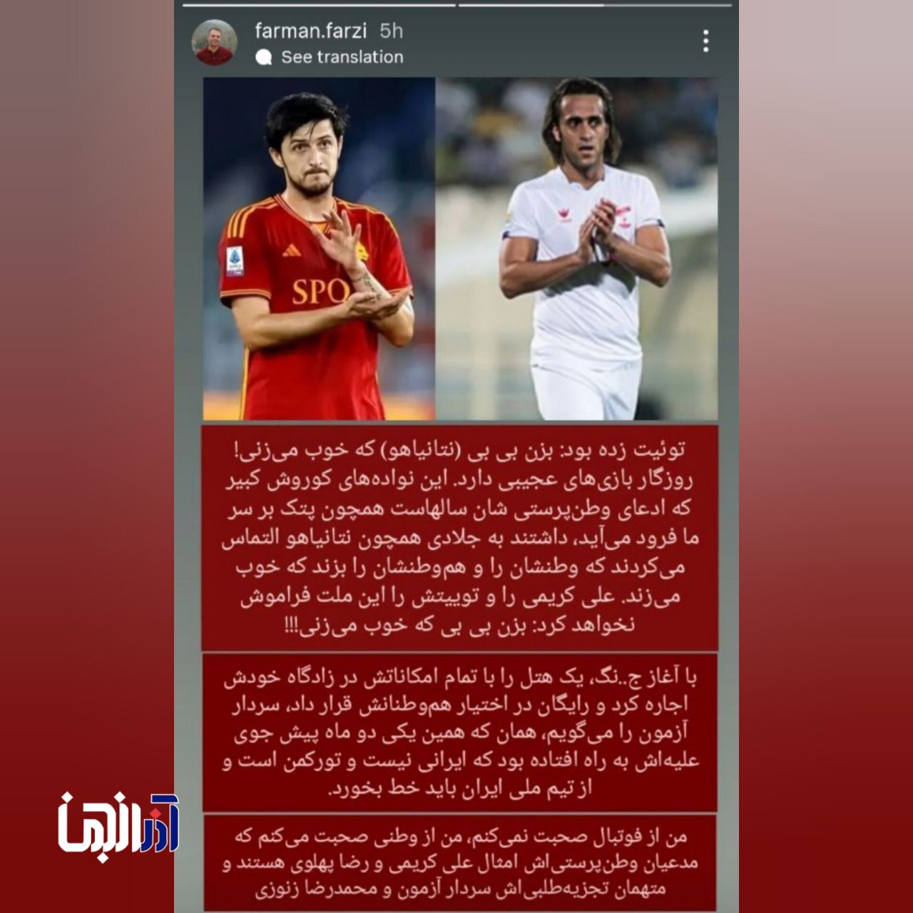 فرمان فرضی، با انتقاد از توییت علی کریمی در حمایت از نتانیاهو و تمجید از اقدامهای انساندوستانه سردار آزمون پرداخت و تضاد مواضع این دو چهره ورزشی را در مسائل ملی مورد بررسی قرار داد.