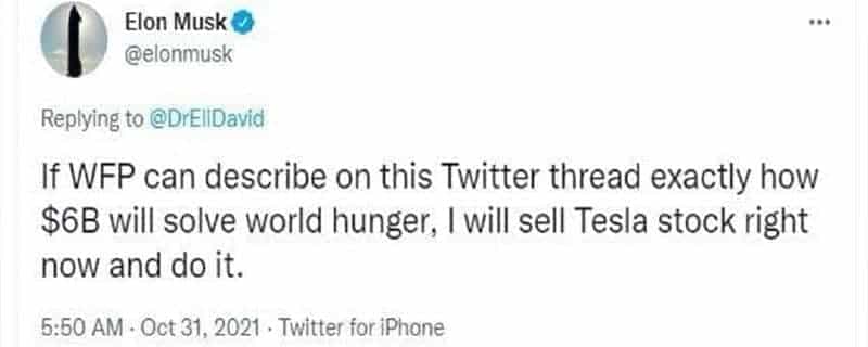 ایلان ماسک گفت: اگر سازمان ملل ثابت کند ۶ میلیارد دلار گرسنگی جهانی را رفع می‌کند، سهام تسلا را می‌فروشد.