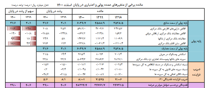 رشد نقدینگی در بهمن ماه ۱۴۰۰ نسبت به سال قبل از آن ۳۹ درصد و در بهمن ۹۹ نیز ۴۰.۶ درصد بود . براساس دادههای آماری بانک مرکزی، حجم نقدینگی در اسفند ماه سال ۱۴۰۰ برابر چهار هزار و ۸۳۲ هزار میلیارد تومان شد.