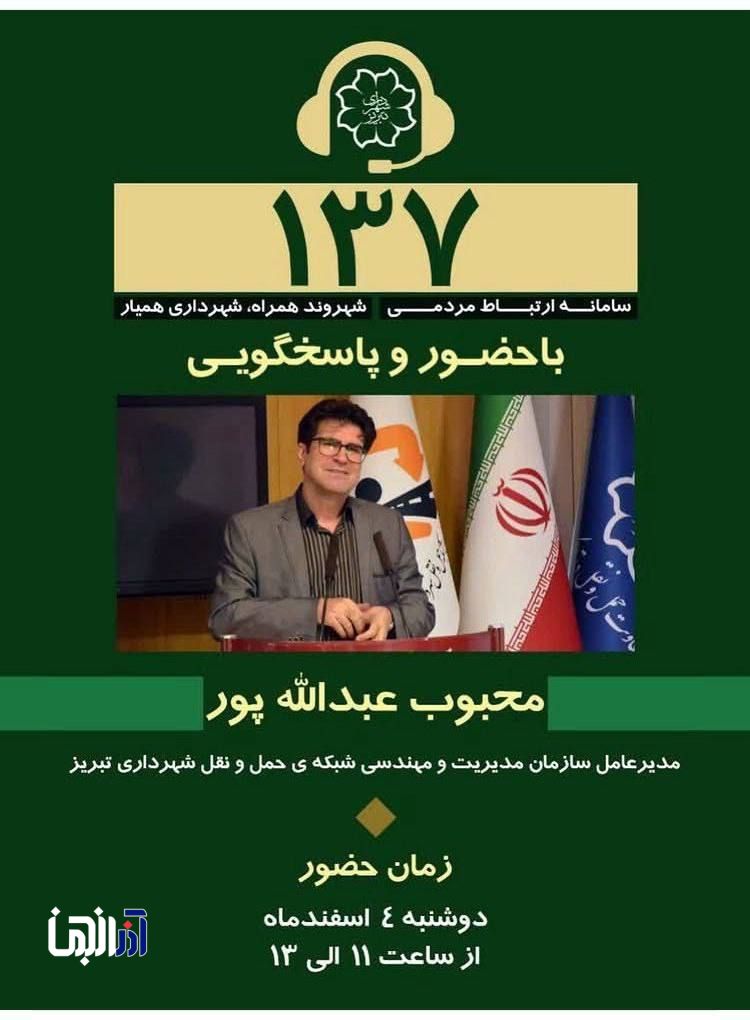 به گزارش آذرانجمن، محبوب عبداللهپور، مدیرعامل سازمان مدیریت و مهندسی شبکه حملونقل شهرداری تبریز، روز دوشنبه ۴ اسفندماه از ساعت ۱۱ تا ۱۳ از طریق سامانه ۱۳۷ پاسخگوی پرسشها و درخواستهای شهروندان خواهد بود. این برنامه با هدف تقویت ارتباط مستقیم مدیریت شهری با مردم برگزار میشود.