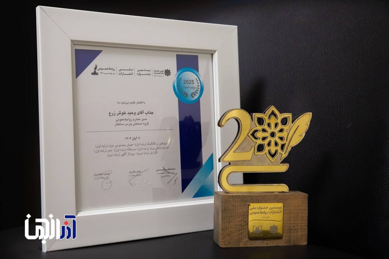 به گزارش آذرانجمن، در مراسم اختتامیه «بیستمین جشنواره ملی انتشارات روابطعمومی» که با حضور اساتید و چهرههای برجسته این حوزه از جمله پروفسور باقر ساروخانی، پدر علم جامعهشناسی ارتباطات ایران و با هدف ارتقای کیفیت تولیدات انتشاراتی، ترویج نوآوری و شناسایی نخبگان حوزه ارتباطات و روابط عمومی برگزار شد، مدیریت و ارتباطات گروه صنعتی پارس ساختار در میان دهها سازمان، نهاد و شرکت صنعتی، با ارائه آثار برجسته در حوزههای مختلف اطلاعرسانی و رسانهای، موفق به کسب عنوان تنها نشریه داخلی سه زبانه کشور شده و در بخش های سرمقاله، خبر، هوش مصنوعی مولد، نشریه داخلی برتر و بروشور و کاتالوگ رتبه نخست و در بخش های گزارش و رپرتاژ آگهی رتبه دوم این جشنواره را به خود اختصاص داد تا تندیس طلایی و دیپلم افتخار بیستمین جشنواره ملی انتشارات روابطعمومی کشور به دکتر وحید خوش زرع مدیر ارتباطات و رسانه ای گروه صنعتی پارس ساختار اهدا شود.